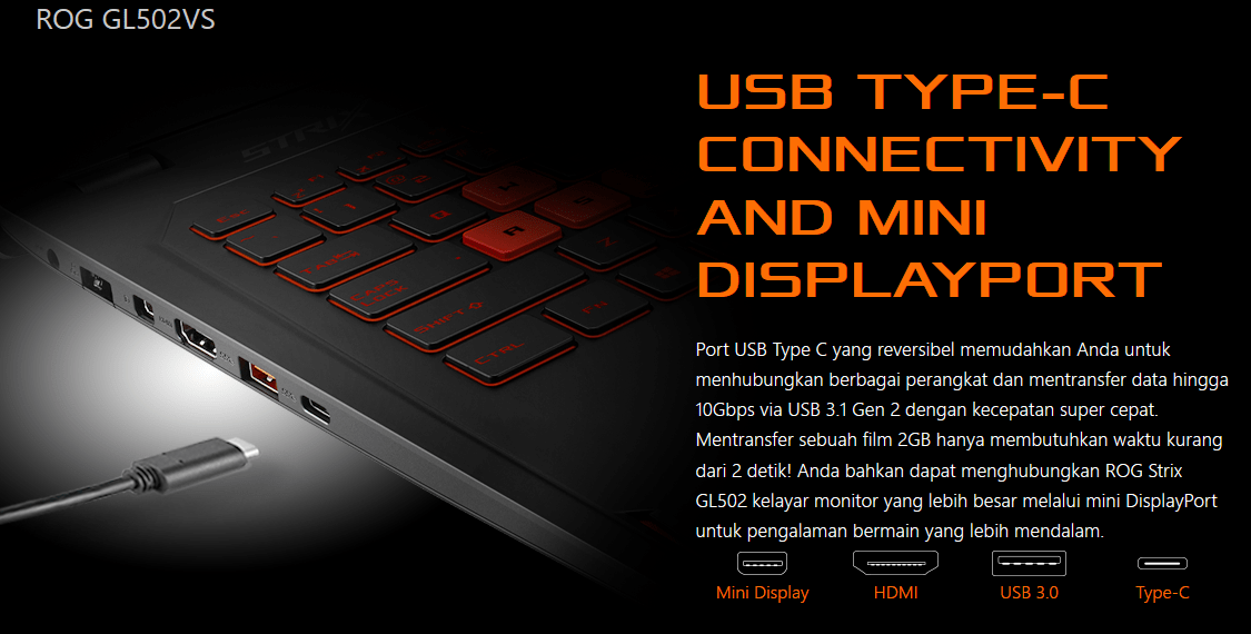 Port USB Type C yang reversibel memudahkan Anda untuk menhubungkan berbagai perangkat dan mentransfer data hingga 10Gbps via USB 3.1 Gen 2 dengan kecepatan super cepat. Mentransfer sebuah film 2GB hanya membutuhkan waktu kurang dari 2 detik! Anda bahkan dapat menghubungkan ROG Strix GL502 kelayar monitor yang lebih besar melalui mini DisplayPort. Port USB Type-C ini pun memiliki bentuk yang kecil dan simetris, sehingga mempermudah pemasangan ke port USB tanpa khawatir terbalik.