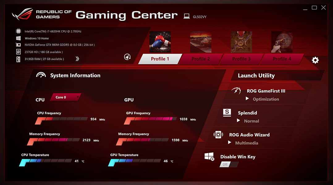 GL502VS menggunakan full-size chicklet keyboard yang dilengkapi dengan backlight dan jarak tekan sebesar 1,6 milimeter yang memastikan kenyamanan pengguna dalam bermain. Tak hanya itu, ASUS juga memperhatikan kebutuhan para gamers, oleh karena itu, ASUS menambahkan tanda khusus di tombol WASD untuk memudahkan pengguna saat bermain dalam suasana redup.